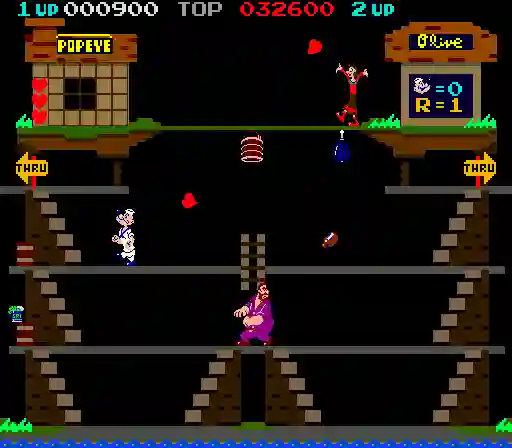 - Classic Single-Screen PlatformingNavigate the iconic three-screen stages, each with unique hazards like descending stairs and jumping from sinking boats, to collect hearts, musical notes, and letters from Olive Oyl before time runs out, in gameplay that defined early arcade precision.